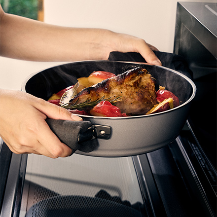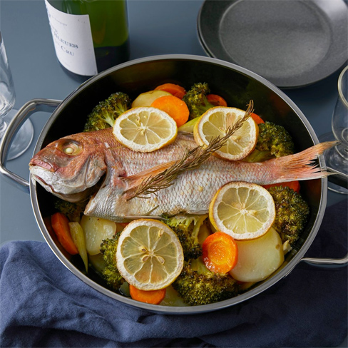 魚や肉を焼いてから蒸したり、煮込み料理、炊き込みご飯など、フライパンと鍋の両方の用途で便利に活躍します。 浅型の鍋なので、肉や魚、パンなど様々なオーブン料理にも大活躍します。
